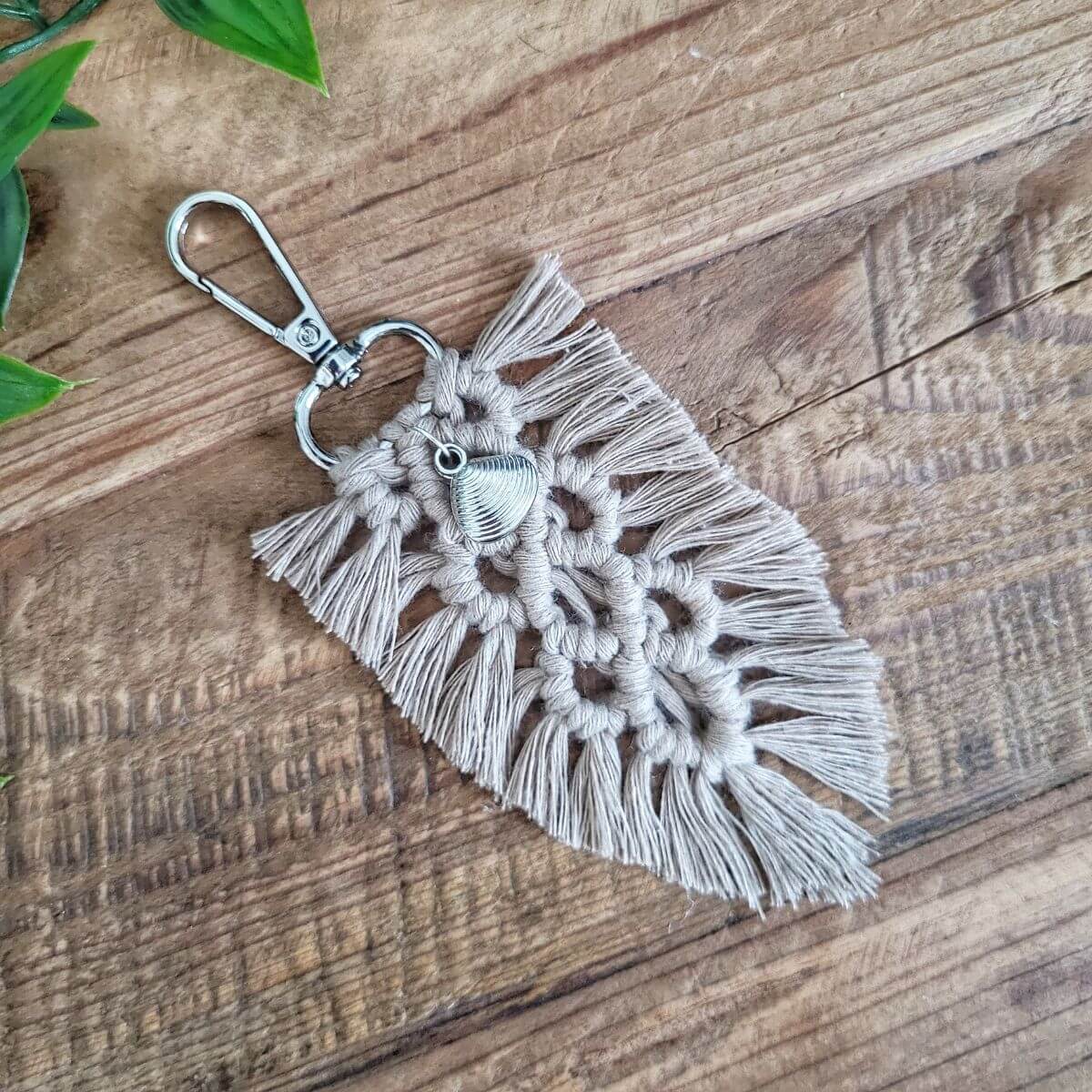 Elegantti ja boheemi makramee-tekniikalla tehty hiekanruskea amulettisulka hopeanvärisellä sirolla näkinkenkä-amuletilla.